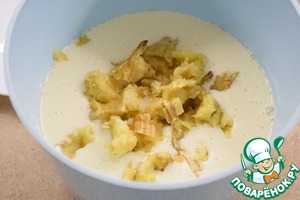 В полученную массу добавляем измельченные бананы: измельчаем прям руками, рвем на кусочки. Перемешиваем лопаточкой.