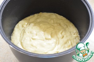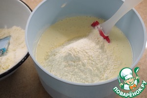 Добавляем муку, смешанную с разрыхлителем. Перемешиваем аккуратно и тщательно. Тесто должно быть как густая сметана.