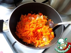 Отправляем содержимое сотейника в кастрюлю, где у нас уже сварился рис. Солим суп по вкусу.