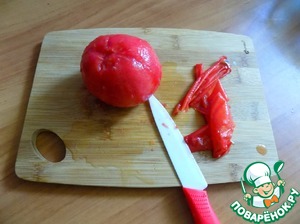 Нам понадобится для супа помидор. с него предварительно нужно снять кожицу. Для этого надсекаем его крест на крест и опускаем на минуту в кипяток. кожица легко снимется. Режем помидор небольшим кубиком.