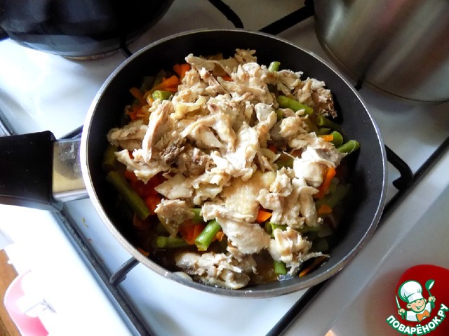 • Выкладываем разобранное куриное мясо. Овощи у нас уже готовы.