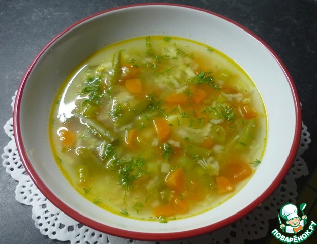 Куриный суп со стручковой фасолью, овощами и рисом. Сытный, не тяжелый суп на обед из свежих овощей.