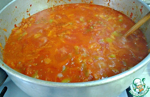 Добавляем томатный соус (не пасту), соль и сахар, пробуем на вкус, и если всё устраивает, тушим овощи 1 час.