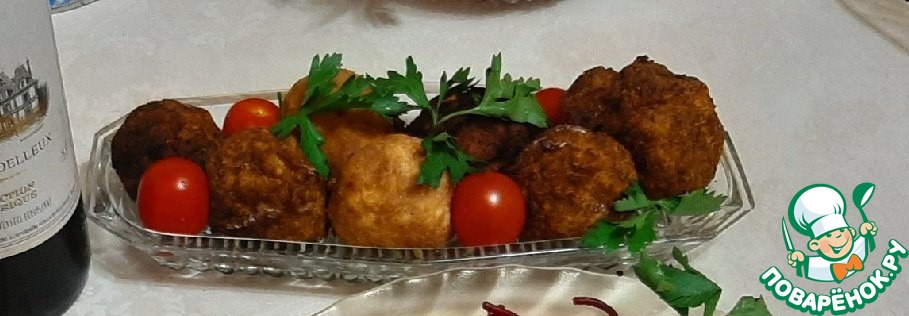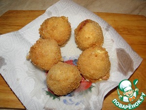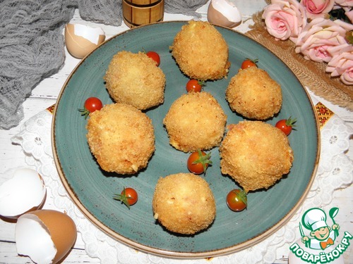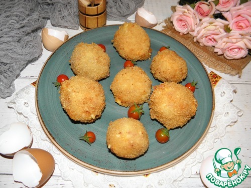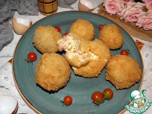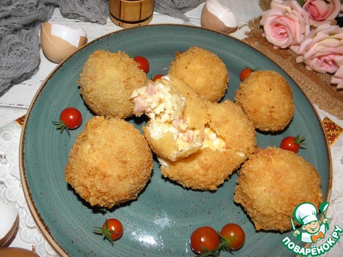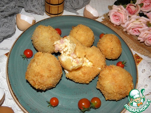 Наслаждение какое! Это чудо золотое! Шарики воздушные! Несомненно вкусные! Невесомый кляр хрустящий, яйца, сыр и ветчина! Соус будет настоящий сливочный из молока! Очень всем рекомендую! Вы попробуйте, друзья! Ведь закуску нам такую пропустить никак нельзя!