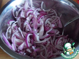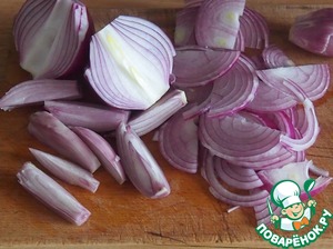 Две небольшие красные луковицы нарезать тонкими полукольцами, а крупные луковички-шалот разрезать на четыре части. Лук этих сортов имеет более нежный вкус, чем обычный, для этого рецепта просто идеальальный вариант.