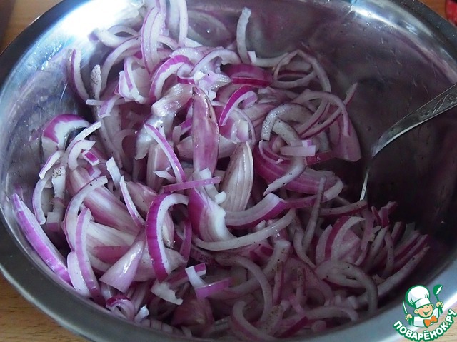 Поместить нарезанный лук в миску, посолить, поперчить, добавить оливковое масло и перемешать.