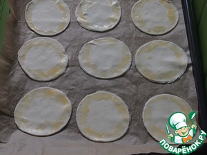 Противень застелить бумагой для выпечки, разложить кружочки теста. Яйцо взбить вилкой и смазать им краешки теста шириной примерно 1,5 см.