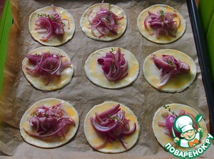 В средину каждого кружочка выложить лук. Сверху положить веточку тимьяна или посыпать сухим тимьяном. Поставить в разогретую духовку и выпекать 20 минут.