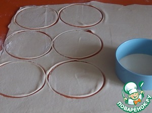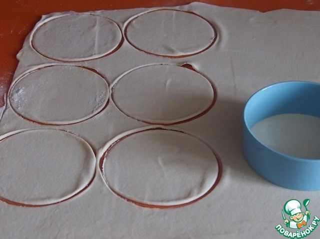 Тем временем включить духовку на 200 градусов и раскатать тесто. Формой или блюдцем диаметром 12-15 см вырезать кружочки. У меня вырубка 12 см, тесто раскатала довольно тонко, получилось 13 штук. Но можно раскатать тесто не так тонко, слоечки будут пышнее.