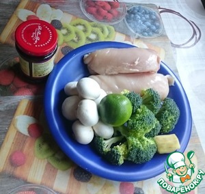 Складываем курицу и грибы в одну миску, добавляем 3 ст. л. соуса "Хойсин", сок одного лайма, немного соли и тертый на мелкой терке имбирь.