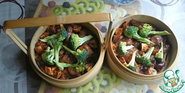 Кладем в емкость пароварки нашу курицу, сверху курицы выкладываем брокколи. Закрываем крышкой. -