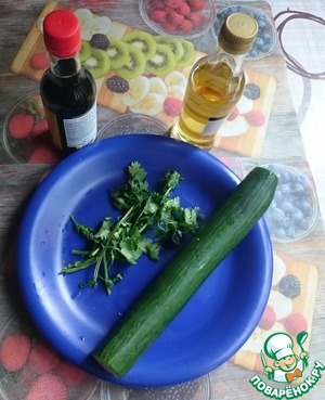 Добавляем 1 -2 ст. л. соевого соуса (зависит от размера огурца), 1ст. л рисового уксуса, мелко нарубленные листики кинзы. 1-2 зубчика чеснока, пропущенного через пресс.