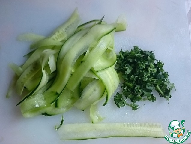 Огурец нарезаем тонкими пластинами по всей длине. Сердцевину не трогаем, семечки нам не нужны, да и сока там слишком много. Очень уобно использовать для этого овоще чистку.