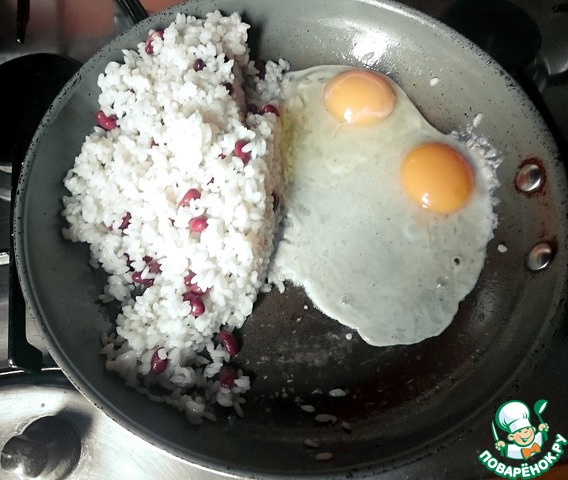 Сдвигаем рис на край сковороды, на освободившееся место наливаем немного растительного масла, вбиваем 1-2 яйца.