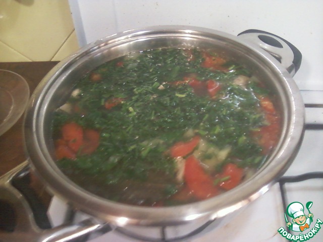 Когда картошка готова добавляем помидоры, зелень, даем закипеть, выключаем газ и накрываем крышкой. Даем настояться полчаса.