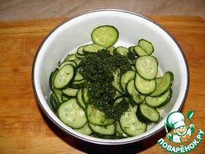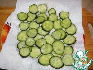 Огурцы моем, нарезаем тонкими кружками (если у огурцов кожица толстая, лучше срезать)