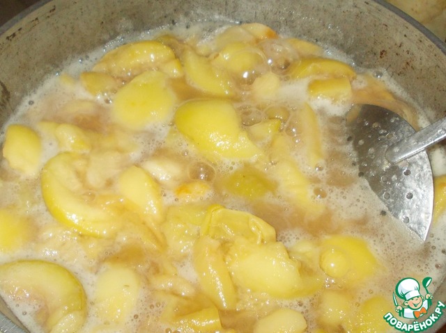 Крышку снимаем и увеличив огонь увариваем персики 40 минут. До хорошо разваренного состояния.