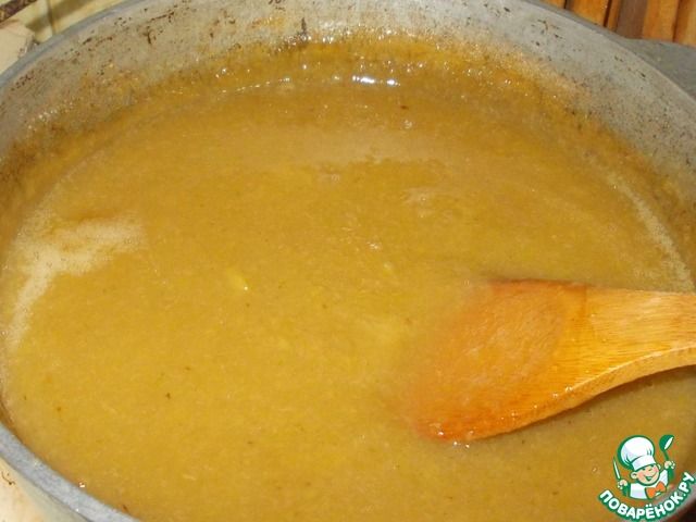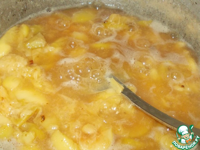 Персиковую некондицию складываем в казан. Подливаем воду. Накрываем крышкой и на небольшом огне томим 15-20 минут.