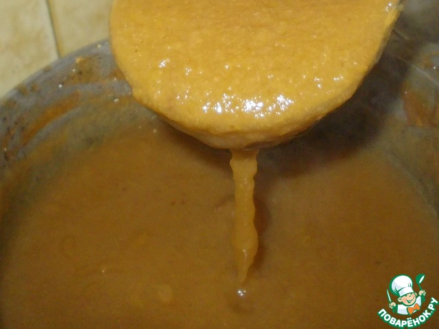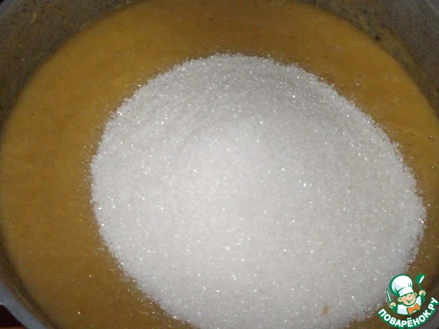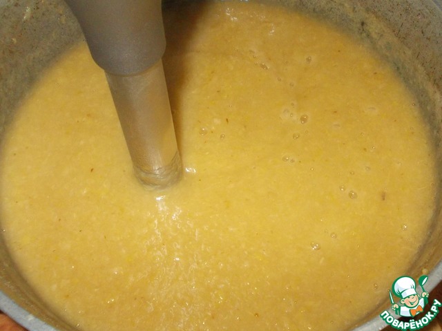 Поднимающиеся пенки снимаем. Персики пюрируем погружным блендером.