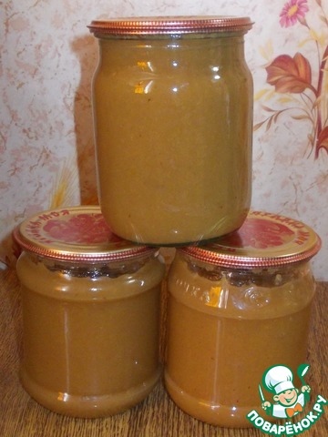Разливаем по стерильным банкам. Закатываем стерильными крышками. Переворачиваем и оставляем на несколько часов в таком виде. Укутывать не надо. Через пару часов банки ставим дном вниз до полного остывания. Выход три баночки по пол литра.