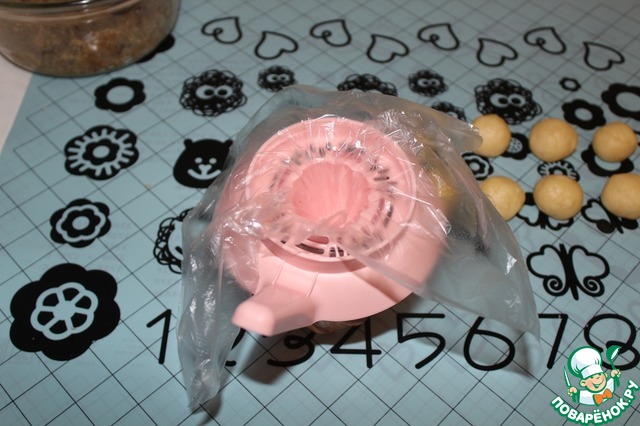 Формируем печенье с помощью ручного пресса для цитрусовых. Застилаем выемку пленкой.