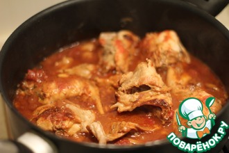 • В ту кастрюлю, в которой будет красный кролик, выкладываем измельчённые помидоры, чеснок. Наливаем воду, чтобы чуть-чуть покрыло мясо и ставим тушиться накрыв крышкой.
