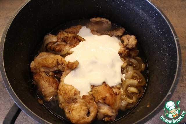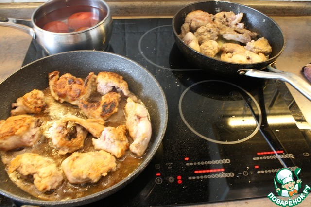 • Когда сковородки хорошо прогреются, берём куски мяса, начинаем обваливать в панировке и выкладывать на сковороду начиная с больших кусочков. Выложив одну миску на сковороду, выкладываем вторую на другую сковороду. Панировка из муки будет играть в дальнейшем важную роль в приготовлении соуса.