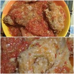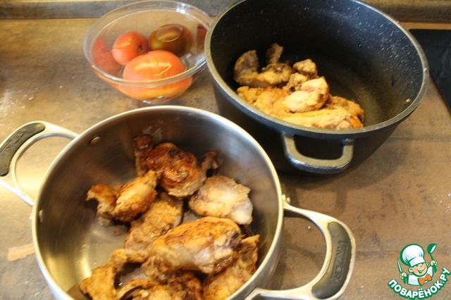• Сейчас начинается самое интересное, сейчас будут рождаться два разных, очень вкусных блюда - рагу (красный кролик) и фрикасе (белый кролик). Сразу хочу остановить поток замечаний, поправлений и тому подобных "... ний". Рагу и фрикасе это не названия конкретных блюд, это название процесса тушения. Фрикасе - тушение курицы, кролика, индейки и любого другого мяса в белом соусе (сметане), рагу - в тёмном, коричневом... Итак, начинаем колдовать над нашими заветными кастрюлями... Обжаренный лук выкладываем на наши кусочки крольчатины, каждая сковорода в свою кастрюлю.