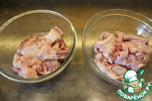• Сейчас начнём делить кролика пополам, для этого возьмём две мисочки. Отделяем окорочка, каждый окорочок разрезаем по суставу на две части и складываем каждый в разные ёмкости.