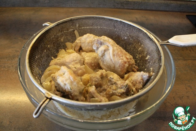 • Теперь немного поколдуем над белым соусом. Берём какую нибудь ёмкость, мелкое сито и процеживаем кастрюлю с белым соусом. Мясо пока отставляем.
