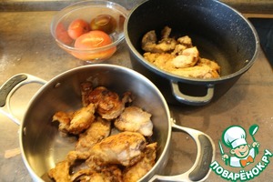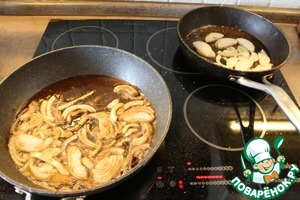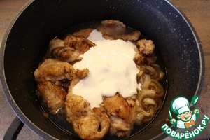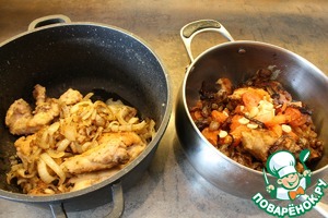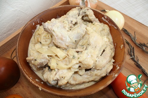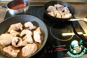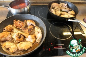 Сейчас начинается самое интересное, сейчас будут рождаться два разных, очень вкусных блюда - рагу (красный кролик) и фрикасе (белый кролик). Сразу хочу остановить поток замечаний, поправлений и тому подобных "... ний". Рагу и фрикасе это не названия конкретных блюд, это название процесса тушения. Фрикасе - тушение курицы, кролика, индейки и любого другого мяса в белом соусе (сметане), рагу - в тёмном, коричневом... Итак, начинаем колдовать над нашими заветными кастрюлями... Обжаренный лук выкладываем на наши кусочки крольчатины, каждая сковорода в свою кастрюлю.