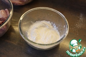 Когда сковородки хорошо прогреются, берём куски мяса, начинаем обваливать в панировке и выкладывать на сковороду начиная с больших кусочков. Выложив одну миску на сковороду, выкладываем вторую на другую сковороду. Панировка из муки будет играть в дальнейшем важную роль в приготовлении соуса.