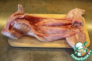 Сразу хочу сказать - в этом рецепте большое количество пошаговых фотографий. Это связано с тем, что мы будем готовить одновременно два вкусных блюда и с тем, что на сайте много начинающих поварят, ни разу не готовивших это вкусное мясо. Мясо кролика готовится по принципу курицы, индейки или любого другого мяса, поэтому если кто-то боится приступать к готовке по каким-либо предубеждениям, хочу сказать - отбросьте свой страх, никого не слушайте и вперёд - у Вас всё получится!!! Первое блюдо, которое будем делать это - красный кролик (рагу), второе - белый кролик (фрикасе). Ещё раз напомню - мы ничего не вымачиваем-замачиваем, кролика перед готовкой не моем, он должен быть сухим. Время приготовления примерно 30 минут. Итак, приступим... Берём тушку, удаляем потрошки, весь внутренний жир, который и придаёт специфический вкус крольчатине.