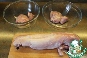 Сейчас начнём делить кролика пополам, для этого возьмём две мисочки. Отделяем окорочка, каждый окорочок разрезаем по суставу на две части и складываем каждый в разные ёмкости.