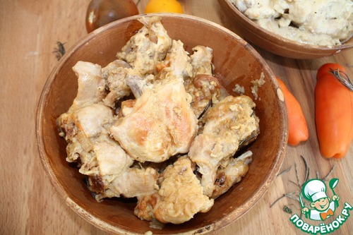 Выливаем наш загуститель в кастрюлю с горячим соусом, тщательно размешиваем, выправляем на соль и возвращаем обратно наше мясо. Хорошо прогреваем на самом маленьком огне и снимаем с плиты. Также снимаем с плиты и нашего красного кролика.