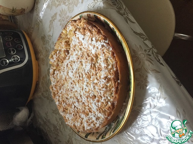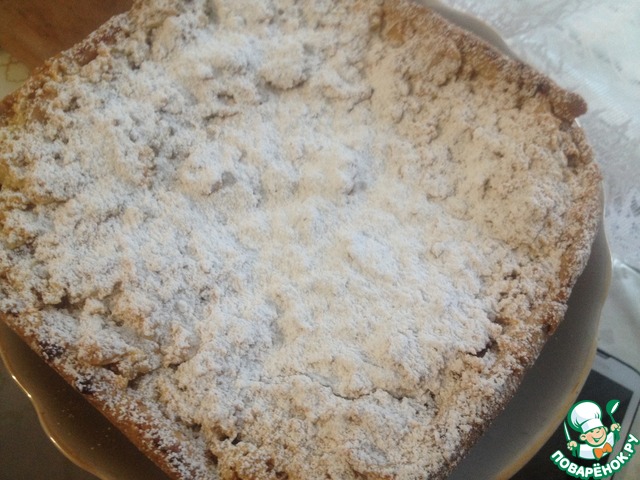 Посыпать верх сахарной пудрой. Я посыпаю сразу горячий пирог, так как у меня есть нетающая сахарная пудра от ТМ "НAAS", очень удобно.
