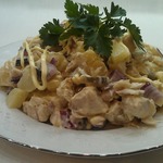 Вчера жарила навагу, осталось два хвоста, не уму не сердцу...Наткнулась на этот рецепт и из хвостов получился отличный, сытный, вкусный салат! Сверху посыпала лимонным перцем.