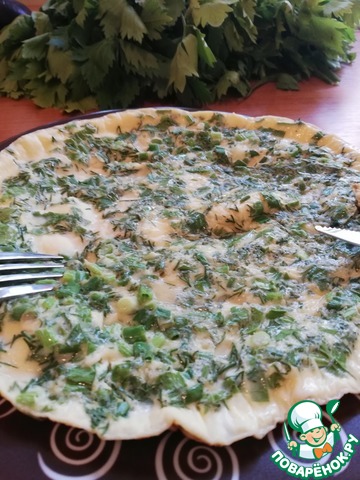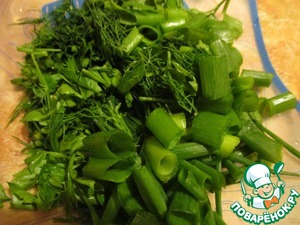 Яйца взбить вилкой с ложкой сметаны, что бы она растворилась. Тушёный кабачок, зелень соединить со взбитыми со сметаной яйцами, посолить, поперчить и размешать.