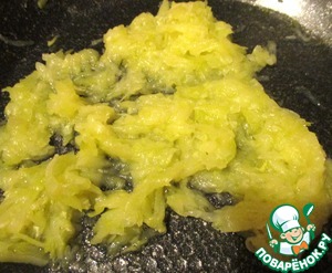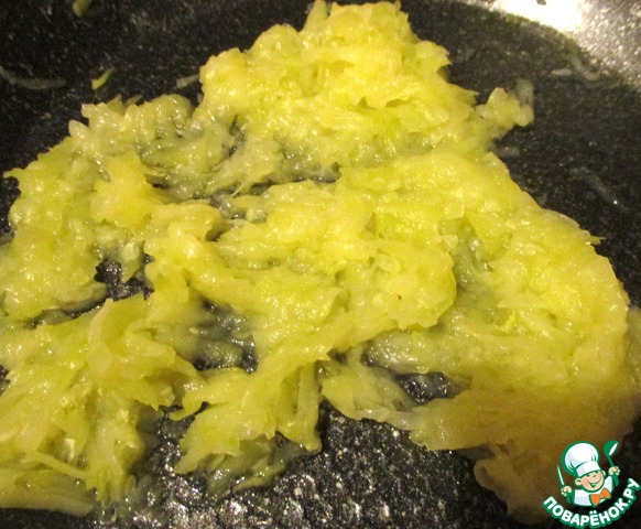 Кабачок натереть на крупной тёрке и протушить с водой под крышкой до мягкости.