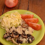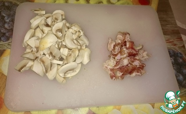Шампиньоны моем, ножки отрываем. Твердоваты он для этого блюда. Шляпки режем на пластинки. Грудинку нарезаем небольшими кусочками.