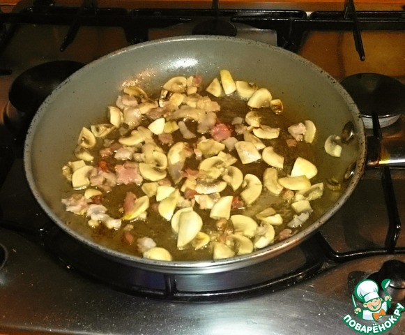 Шампиньоны с грудинкой немного обжариваем в сковороде на смеси сливочного и растительного масел.