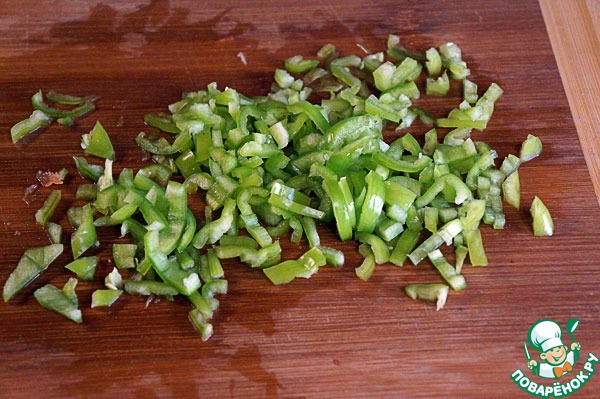 Венгерский перец освободить от семян и перегородок, порезать полукольцами.