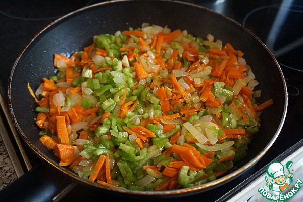 Добавить перец, влить немного бульона (пару столовых ложек), накрыть крышкой и тушить до мягкости моркови и перца. Зажарку отставить.