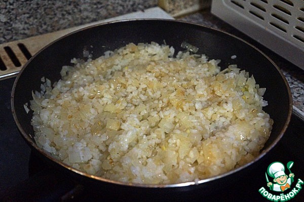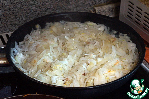 В сковороде распустить топленое масло, пассеровать лук до прозрачности. В конце немного посолить.