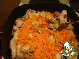 Обжаренную курицу с морковью и луком переложить в казан