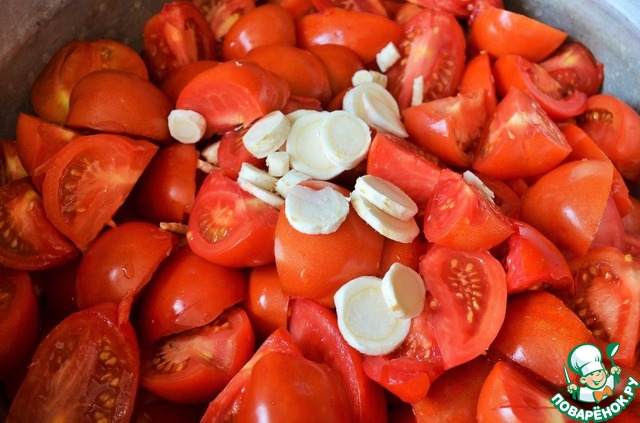 По возможности, удалять кожицу помидоров, для этого и режутся помидоры крупно.