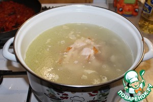 Добавляем отварную курицу. Доводим до кипения и кипятим 5 минут.