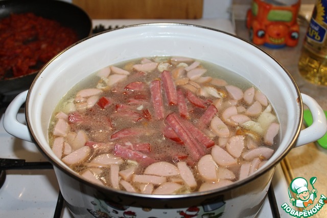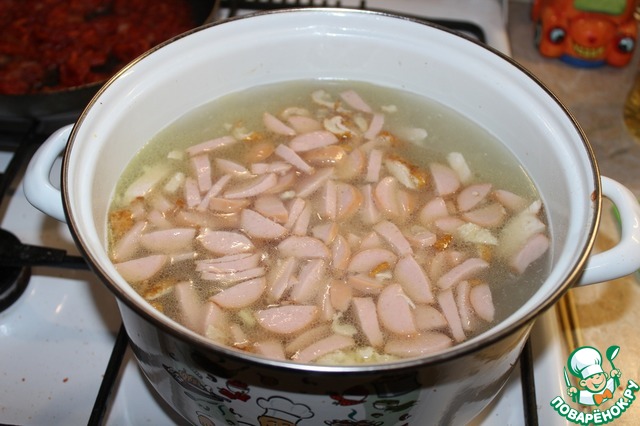 Добавляем сосиски. Доводим до кипения и кипятим 5 минут.