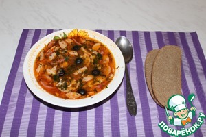 Добавляем маслины. Доводим до кипения и кипятим 5 минут.