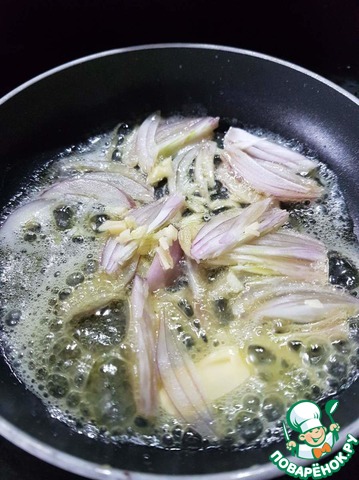 На сковороде растопить масло, обжарить лук и чеснок в течении нескольких секунд. -